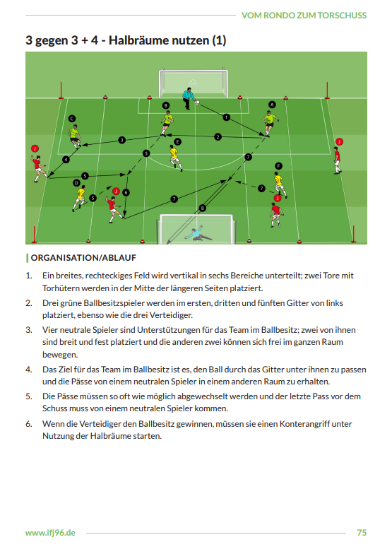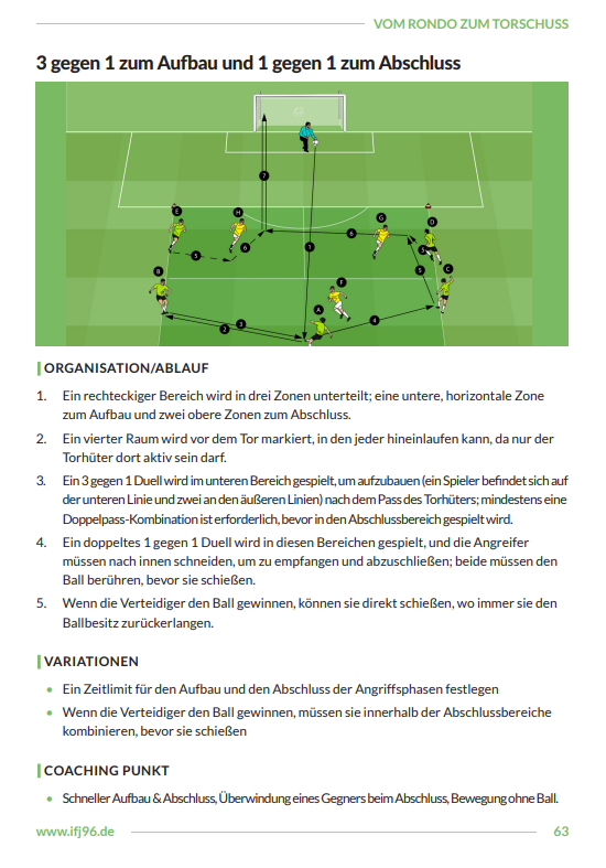 Die Übungen decken ein breites Spektrum ab: von schnellen Passkombinationen und Torabschlüssen nach Flanken über 1-gegen-1-Situationen bis hin zu Überzahlangriffen. So lernen Spieler, unter Druck kreativ und effizient zum Abschluss zu kommen.