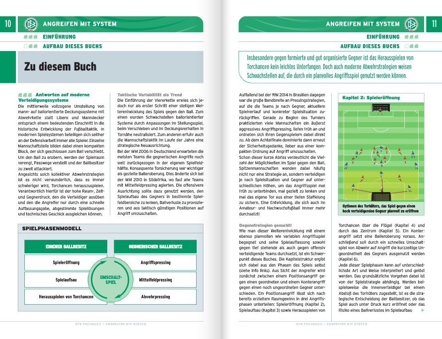 Sie wollen ein möglichst breites Repertoire an individual-, gruppen- und mannschaftstaktischen Angriffsmitteln erarbeiten, damit Ihre Spieler flexibel auf jeden Gegner und dessen Pressingstrategie reagieren können? Angreifen mit System behandelt sämtliche Facetten des Angriffsspiels – von der Spieleröffnung durch den Torhüter über den Spielaufbau und das Herausspielen von Torchancen bis zum so wichtigen Umschaltspiel von Abwehr auf Angriff. Die aus der Analyse des Wettspiels abgeleiteten Offensivlösungen werden zunächst ohne Gegnerdruck eingeübt. Nach und nach wird durch Hinzunahme von immer mehr Verteidigern wettspielnäher trainiert.