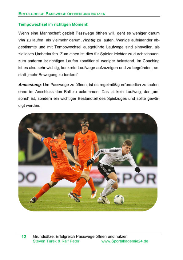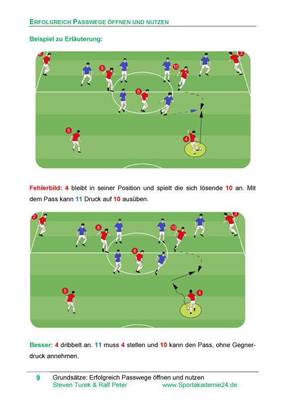 Wir erläutern zu Beginn Grundsätze, die für das Spiel mit dem Ball wichtig sind, um erfolgreich Passwege öffnen und nutzen zu können. Im Anschluss stellen wir konkrete taktische Situationen mit entsprechenden Lösungen vor.