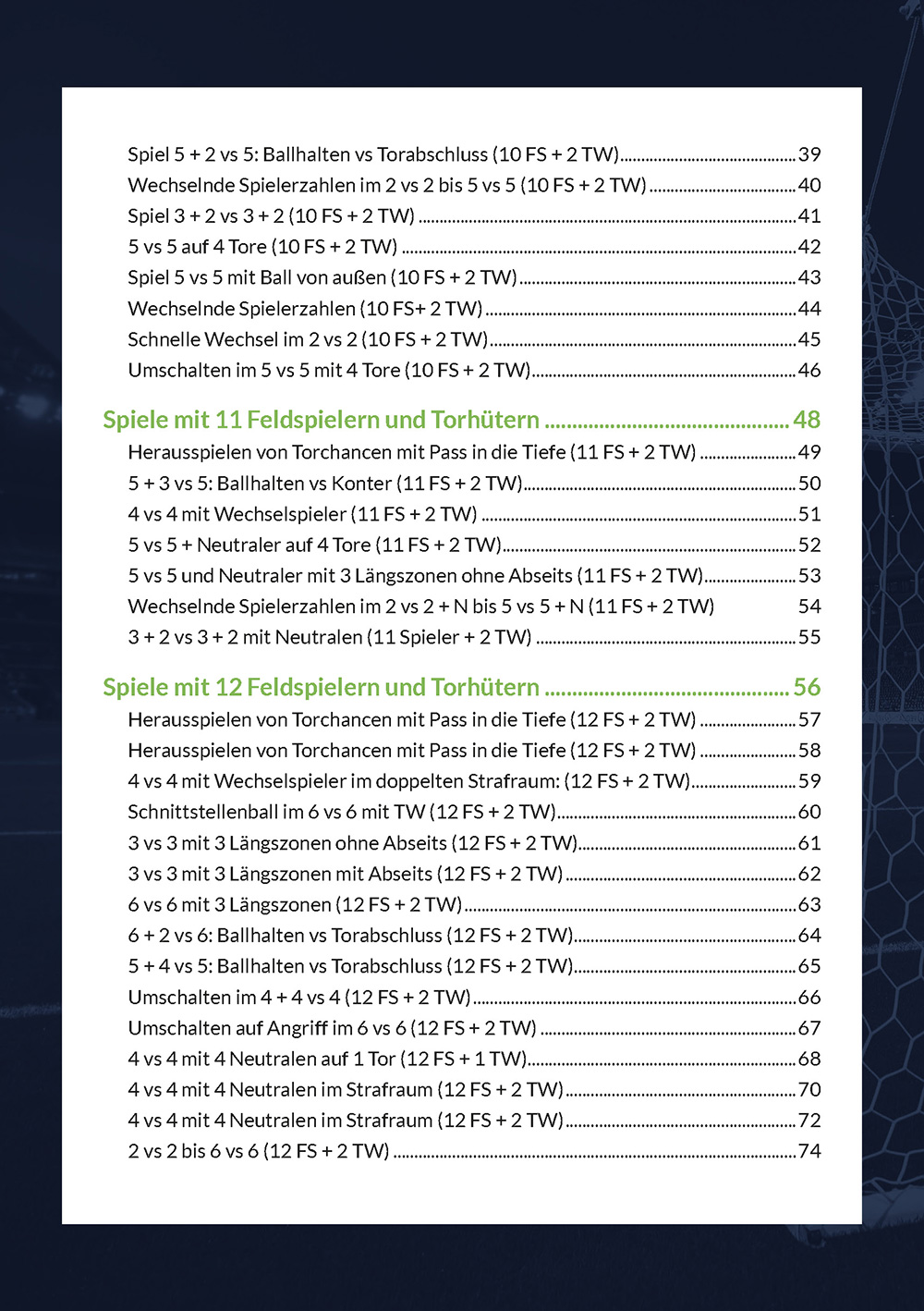 Dazu ist dieses eBook ein zuverlässiger Helfer bei der kurzfristigen Umplanung des Trainings. Vor dem Training kann man im eBook auf dem Smartphone oder Tablett die entsprechenden Spielform auszuwählen.
