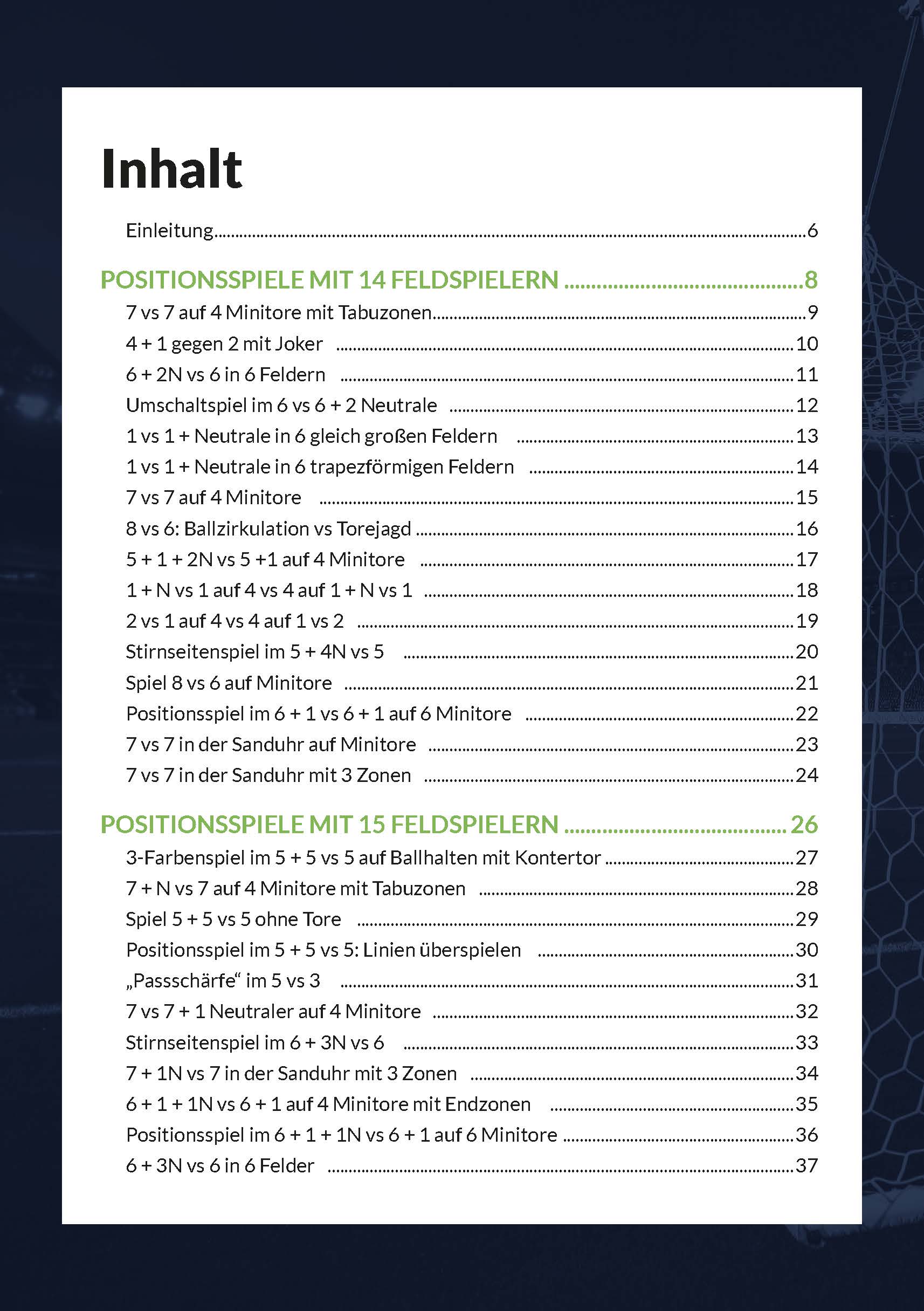 Der vierte Teil der Heftreihe „Flexible Trainingsplanung“ befasst sich mit dem Thema „Positionsspiele für Spielerzahlen von 14 – 20 Spielern“. Wir Trainer kennen alle die Herausforderung, einen tief und kompakt stehenden Gegner zu bespielen. Der Zeit und Raumdruck in der gegnerischen Hälfte wird in Richtung gegnerisches Tor immer größer. Möchte man sich hier nicht nur auf hohe Bälle, Flanken und Standardsituationen verlassen, ist ein kontrollierter Spielaufbau gefragt, um Räume durch Spielverlagerungen, sowie ein variables Angriffsspiel zu schaffen.
