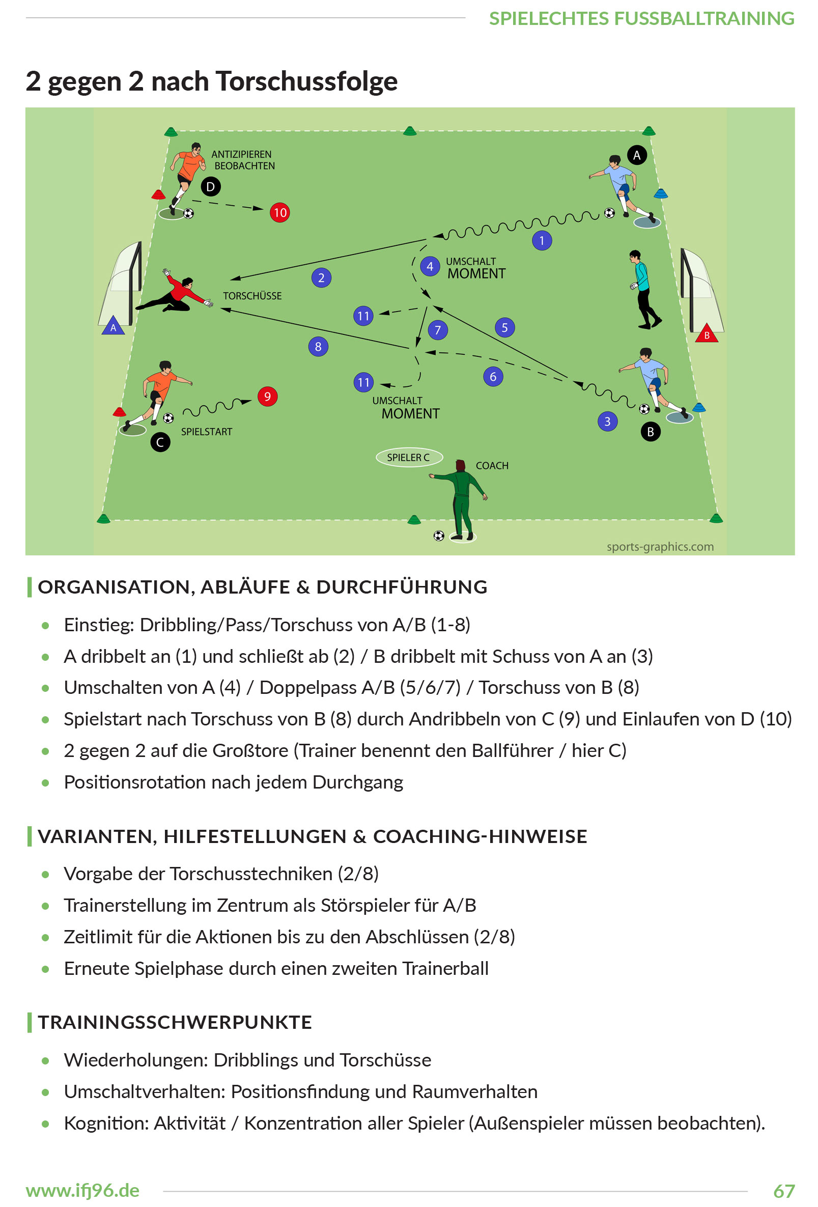 Spielformen werden dabei immer ein Kern des Trainings sein und der Reiz des großen 11 gegen 11 ist beständig. Mit Blick auf die individuelle Entwicklung der Spieler kann das 11 gegen 11 jedoch nur einen Teil der nötigen Trainingsreize darstellen. Kleine Spielformate sind notwendig, um jedem Spieler möglichst viele Ballhandlungen zu ermöglichen. Darüber hinaus sind Übungsformen elementar, um jedem Spieler ausreichend Ballkontakte zu ermöglichen und Techniken abzufordern, welche auf individueller Ebene im 11 gegen 11 nur sehr selten, bzw. nicht ausreichend häufig abgefordert und damit schlichtweg zu wenig trainiert werden.