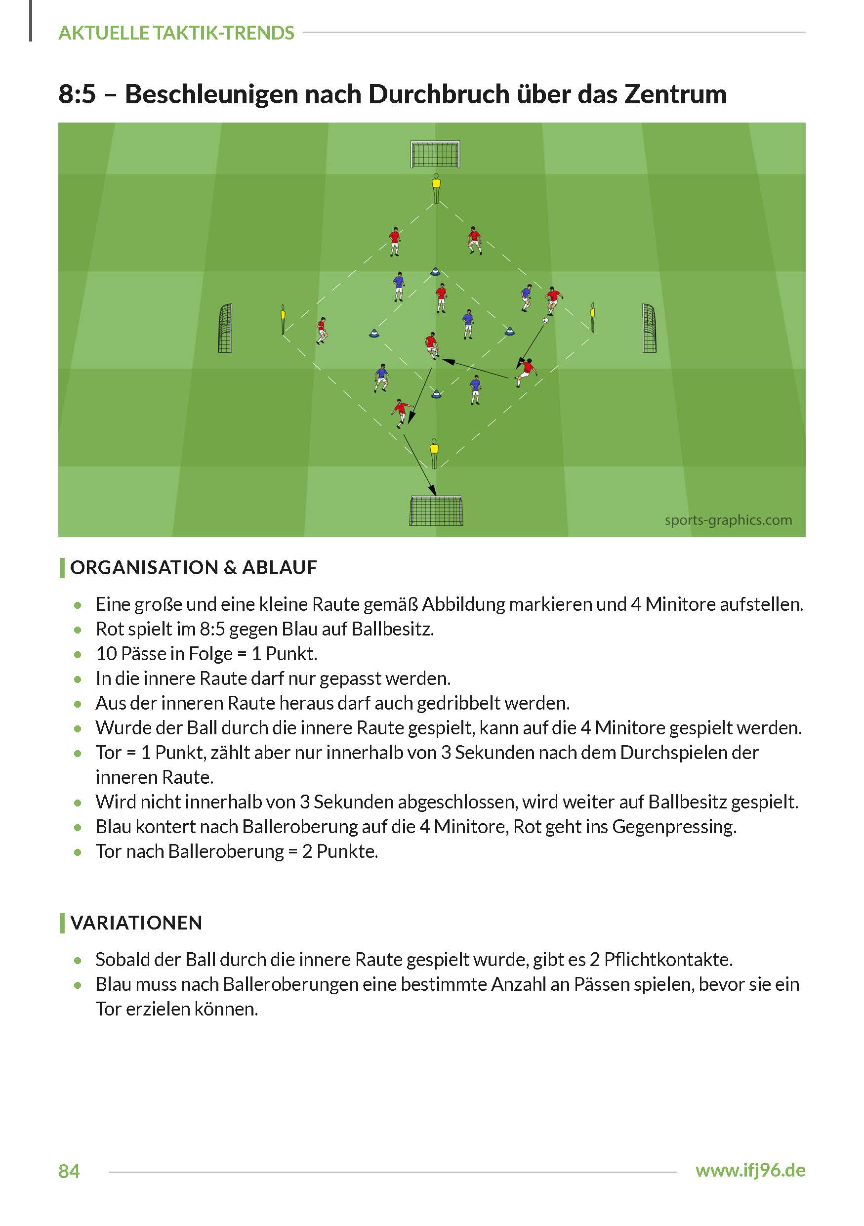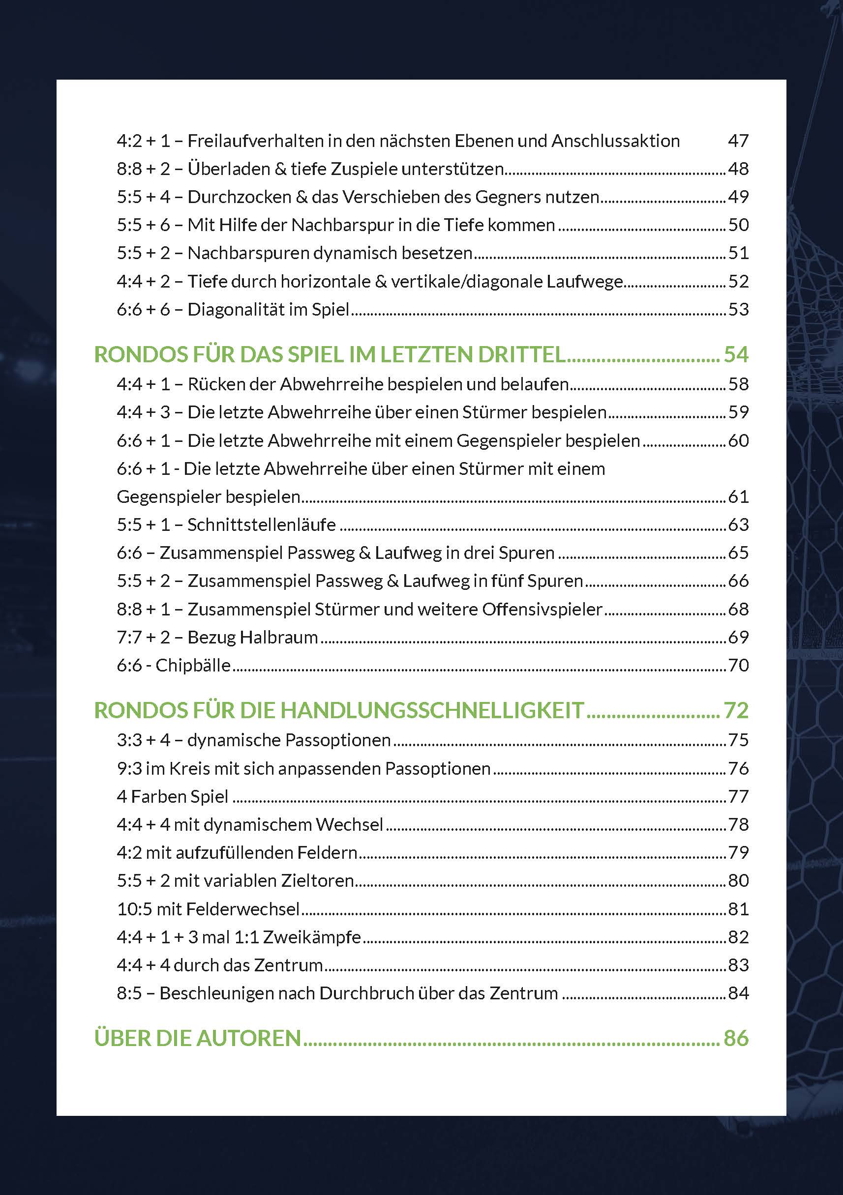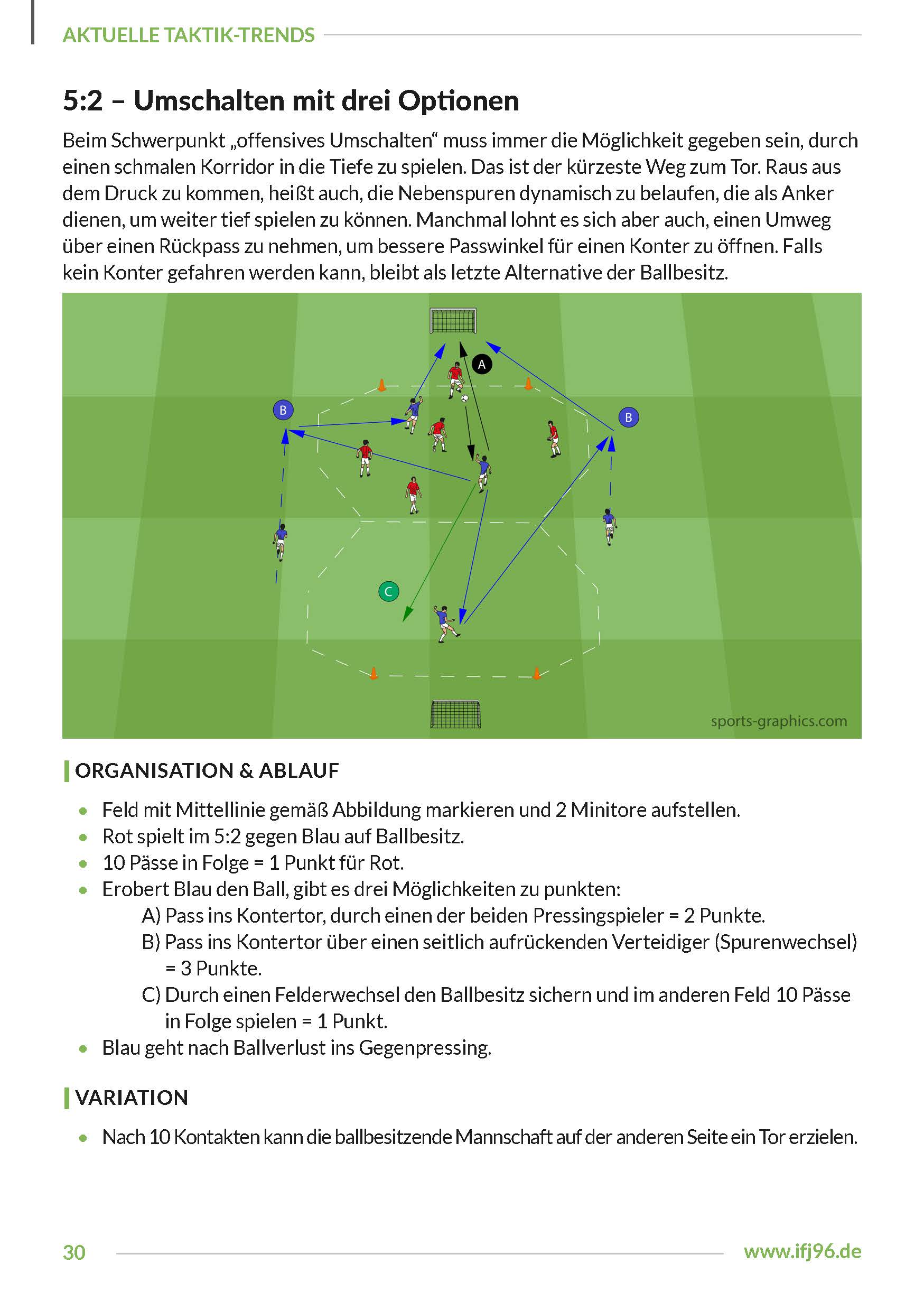 Das eBook von Levent Sürme und Martin Weng hat sehr gute taktische Vorbemerkungen, die die Zielsetzung der Autoren verdeutlichen. Die 5 Themenschwerpunkte werden durch anschauliche Beispiele aus dem Profifußball eingeleitet, mit Hilfe von ausgewählten Spielsituationen der Top-Klubs, wie der FC Bayern München oder RB Leipzig, visuell dargestellt und mit je 10 Spielformen perfekt trainiert.